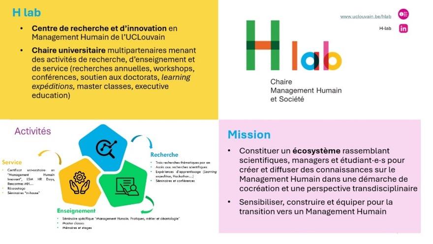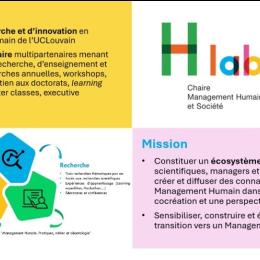 Les organisations sont des acteurs incontournables de la transition. La Chaire Management Humain et Société (H lab) constitue un espace de recherche transdisciplinaire qui permet de diffuser et coconstruire des connaissances scientifiques contribuant en particulier à réhumaniser la gestion de l’entreprise (marchande, non-marchande, publique, privée). Le H lab étudie les enjeux contemporains de la gestion humaine des organisations (fidélisation, attractivité, travail hybride, IA, reconnaissance, flexibilité, développement professionnel…) et soutient l’enseignement, la formation continue, la recherche et la pratique dans le domaine du Management Humain. Depuis 2012, au travers de 40 recherches thématiques menées, l’écosystème de la Chaire a formé 120 professionnels (CEO, DRH, business leaders) à ces enjeux de la gestion, 270 étudiants du master GRH aux enjeux déontologiques de la GRH, 680 professionnels impliqués dans les travaux de la Chaire comme co-chercheurs, 18 chercheuses et chercheurs (dont 3 post-doc), 18 académiques belges et internationaux impliqués dans la direction des recherches.