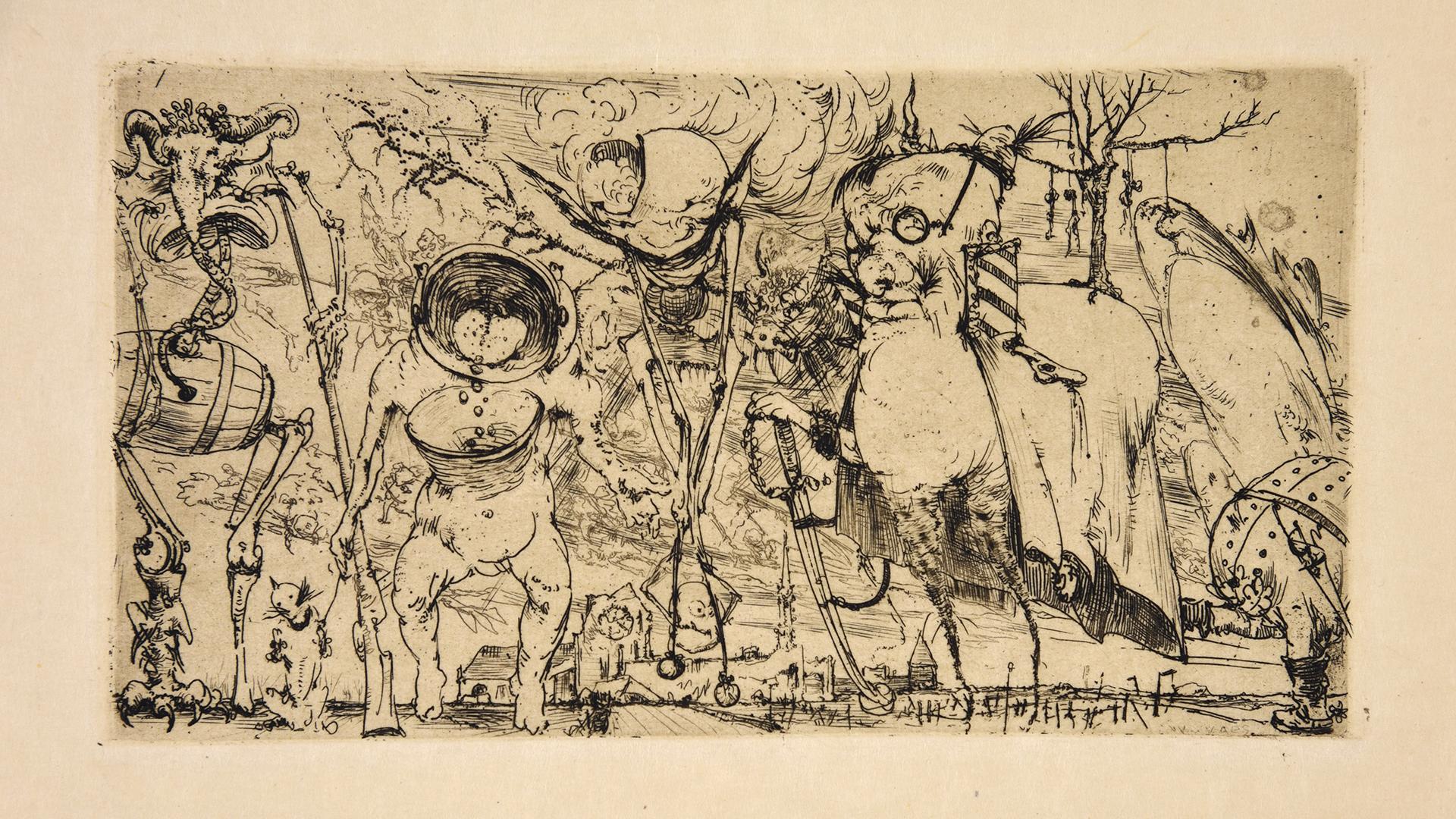 Walter Vaes, Duivelarij, Herrschaften (Diableries, Herrschaften), 1916. Eau-forte sur papier Japon. Musée L, fonds Paul Masson – donation J.-M. Gillis, no inv. 2021.81. © Tous droits réservés / photographie : Musée L – J.-P. Bougnet.
